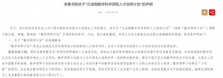 清华大学求真书院关于“丘成桐数学科学领军人才培养计划”的声明。网页截图